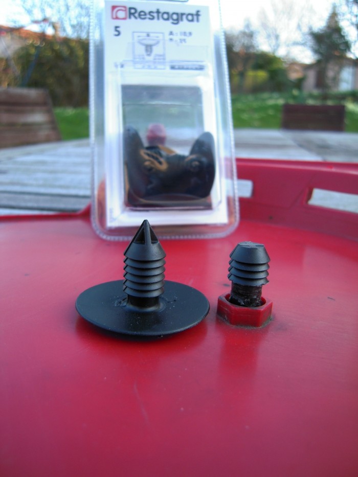 Oui très bon système D Comme demmer..., !quand une visse plastique de maintien de plaque est morte, mettre 1 visse noyé dans laraldite, recouvert d'une gaine electrique rétractable, ça le fait nickel. Et un coup de pinceau retoucheur en peinture côté plaque vue.