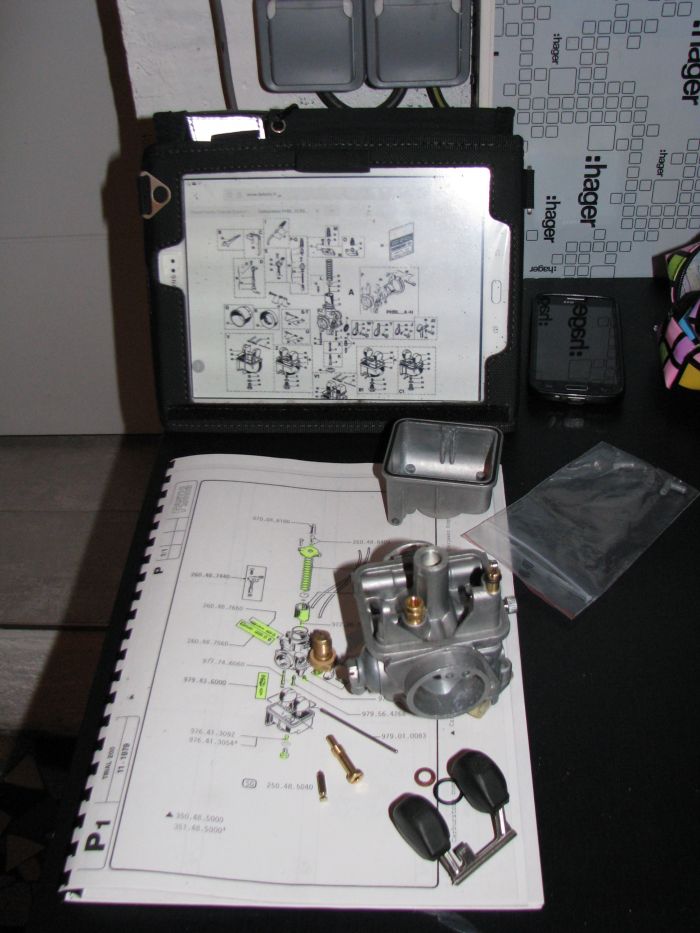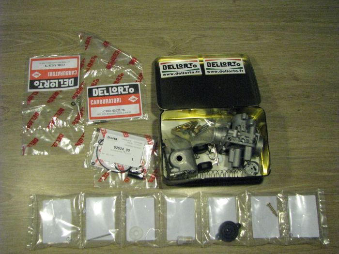 J’ai récupéré aussi mon carburateur qui a été entièrement passé aux ultras sons (chez BDI.production) et reçu les différentes pièces de rechanges achetées directement sur le site www.dellorto.fr ( SWM Europa). Remontage du carbu. le weekend prochain à suivre.
