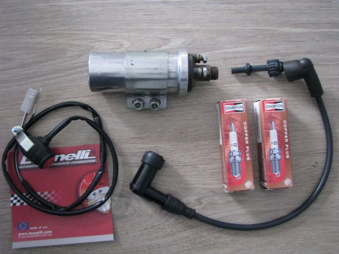 Remplacement du câble haute tension, je conserve l’anti parasite existant et la bobine d’origine Dansi qui fonctionnée avant démontage. J’ai trouvé chez Bosisio la bougie Champion L82C préconisée.