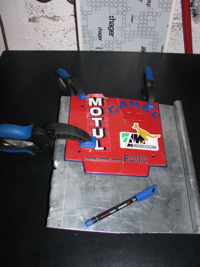 A partir d’une chute d’une plaque alu de 1 mm d’épaisseur et en prenant comme patron ma veille plaque originale avec une découpe à la Drémel, j’en réalise une identique. Elle partira avec le cadre et toutes les pièces à peindre en rouge (RAL 3001).