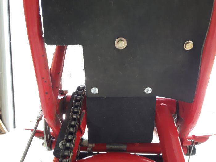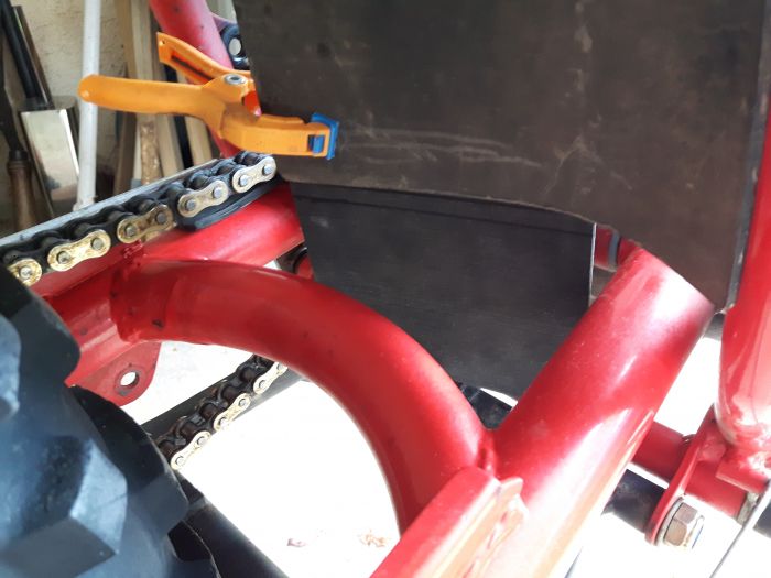 L'hiver approchant et mon terrain étant plutôt gras, je me suis inspiré de ce qu'avait fait Bubb sur son 80, à savoir prolonger cette bavette AR trop courte à l'origine pour protéger le fondement de madame des projections irrespectueuses...