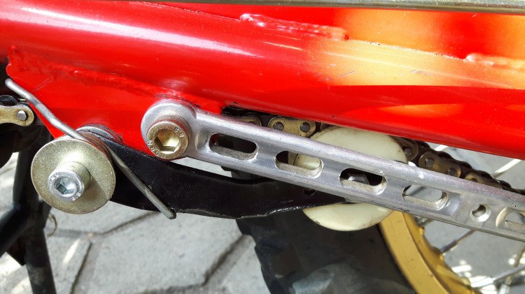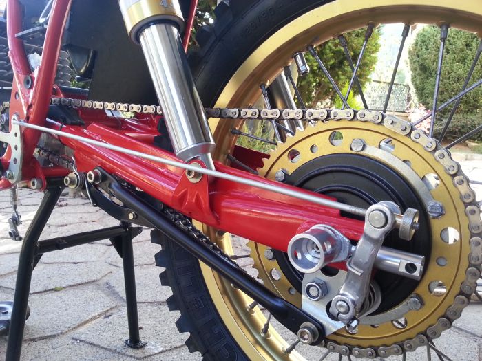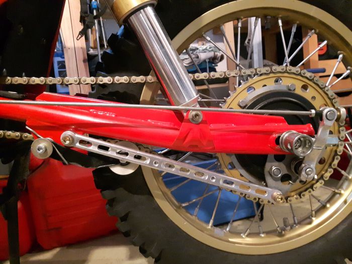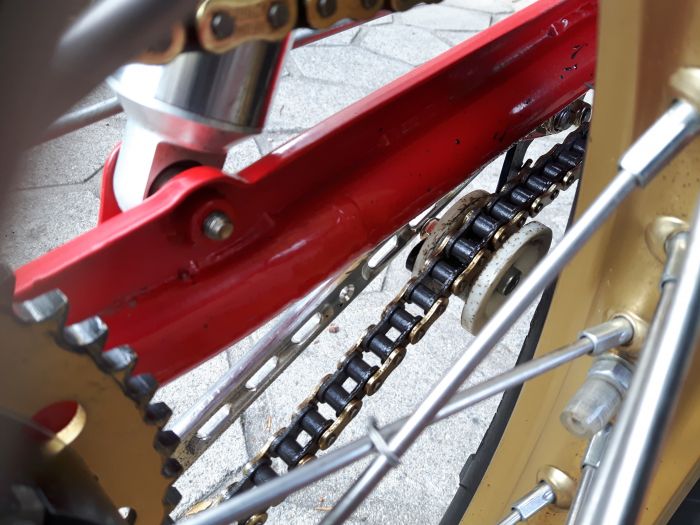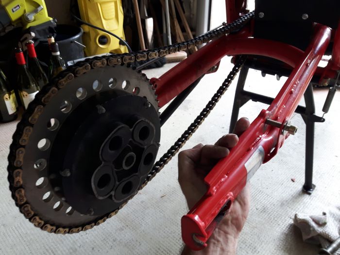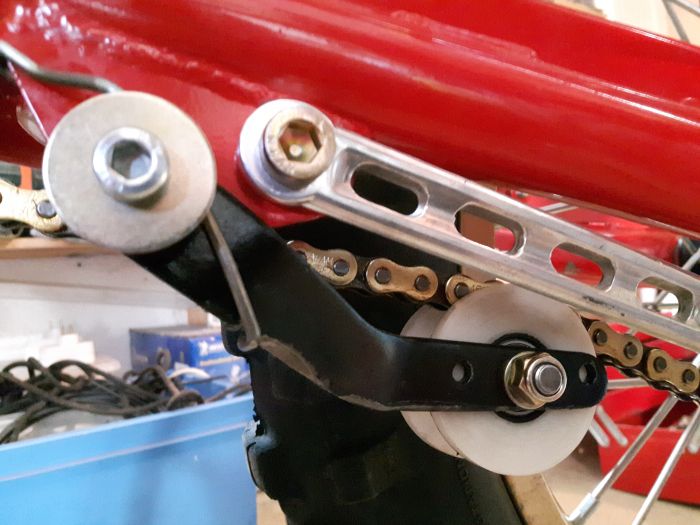 J'avoue avoir un peu galéré pour trouver la bonne longueur de chaine, le tendeur agissant plus fermement sur le brin mou du fait du rayon du galet, mais au final les essais de roulage me font dire que ça marche super! 👍