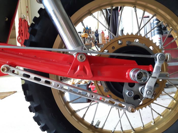 J'en profite pour démonter roue AR et amortisseurs pour contrôler le jeu du bras oscillant.