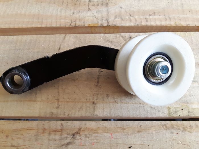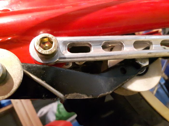 J'ai modifié un peu le montage par la suite en passant l'écrou à l'intérieur du galet pour augmenter le jeu entre tendeur et tirant de frein arrière et en remplaçant la vis CHC par une bonne vieille tête hexagonale classique, plus compacte.