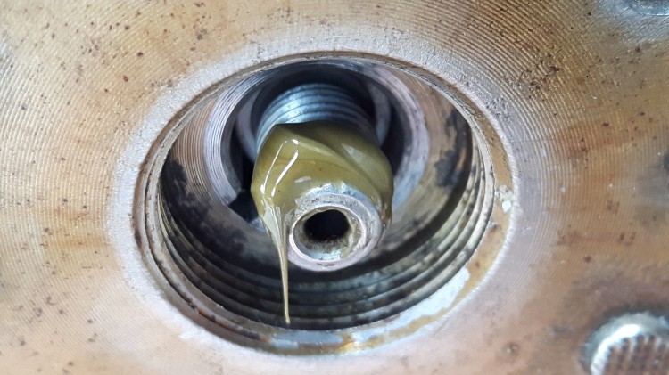 1 - J'ai constaté au démontage du haut moteur, un poil de corrosion en partie inférieure d'un des 4 goujons, sans doute lié à une infiltration d'eau lors des lavages de ma brêle au KARCHER - Décapage à la brosse métallique, traitement au Loctite FRAMETO et bonne dose de graisse au remontage au niveau des centreurs cylindre / culasse.