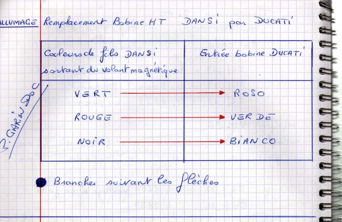 Extrait de la page créée par Chris il y a longtemps (http://www.fanticmotor.asso.fr/r10c_03.htm), "La bobine HT Dansi est introuvable ; elle peut être remplacée par une Ducati 432898112, celle des trials ultérieures de la marque. Dans ce cas, brancher le fil vert (capteur) sur le rouge ; le fil rouge (+allumage) sur le vert ; le noir (-allumage) sur le blanc."
