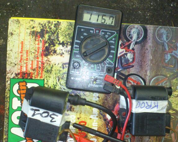 Que des valeurs en volte s'affiche et que t'es pas le temps de noter,normal,en principe bon signe t'as du jus. Maintenant sur ohm en 200 kilo ohms = 200ko, bec rouge du multi sur + bob et l'autre sur moins tu dois avoir 115 ( valeur du ducati + moderne) , et 0,55 entre moins et capteur bob.puis bec rouge sur sortie haute tension et + = 120. Puis en 20ko, toujours bec rouge sur ht et capteur = 5.5. Puis avec le moins= 5. Maintenant toujours en 20ko, bec noir sur fil de masse ou masse bobine et capteur= 0,40.puis sur moins = 0.00. Puis toujours bec noir sur masse le bec rouge sur sorti ht = 5 .ces valeurs concerne leà bob ducati mais le vieux dansi doit s'en approcher. Y doit y avoir sur le forum 1 gars qui te donnera l'exact. Mais tu devrait défir si ok ou hs...si t'as 1 sur tous les canaux ohm, CEST infini ,donc généralement coupé hs er si t'as 000 avec ou sans virgule c'est que ça passe direct et nickel donc résistance hs.( fils fondus en bloc.)