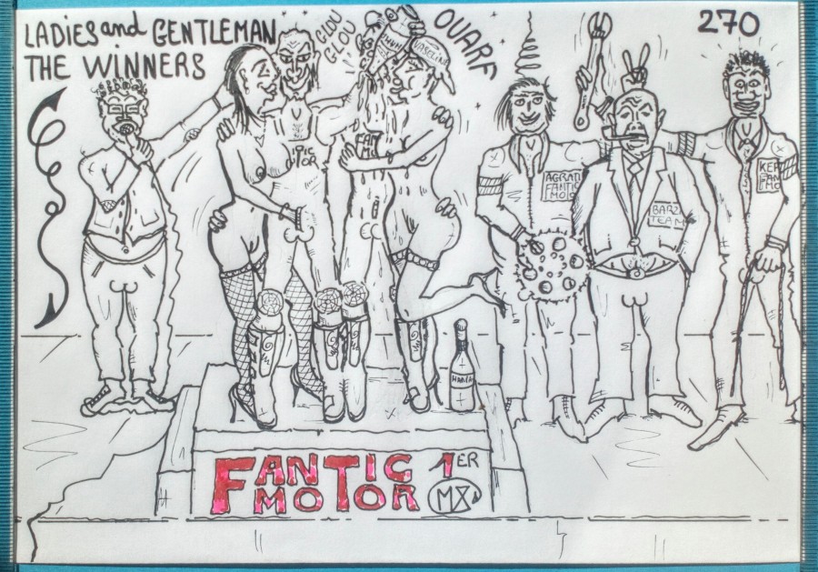 Ya tout ce qui faut...comme une étape du tour de France......le Speaker officiel, les 2 playmate, le champagne a gogo, le concessionnaire homme d'affaires....Mr BLIER...HEU.... MR BARZAGO... et ses 2 mécaniciens de légende... ( fondateurs de la marque fantic motor)..