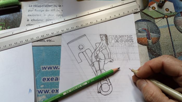 Il m'a dit le logo fantic + vintage + un piston bielle de caballero + une meuff pin up.. Mais là meuff tu la veux comment ?