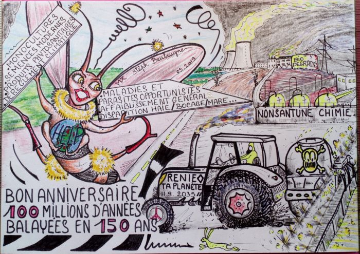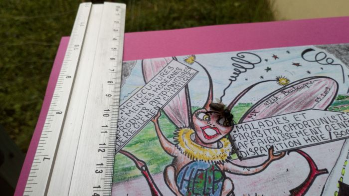 Un dessin que j offre à mon petit rucher, pour la défense de son environnement, lorsqu une abeille noire, se posa sur le coin haut gauche de mon dessin et se dirigea sur l'œil de mon abeille dessinée...elle y resta quelques secondes puis s'envola vers des conquêtes nectariferes...soudain une larme jaillit de l'œil de mon abeille !...