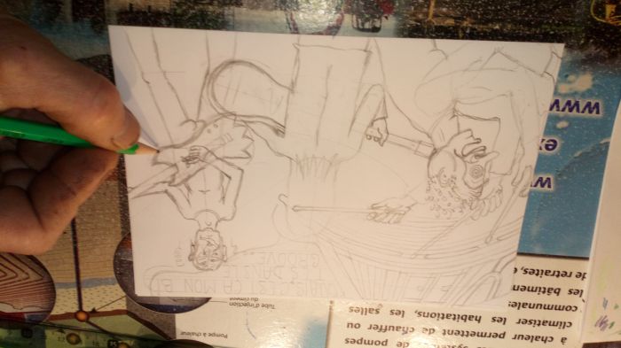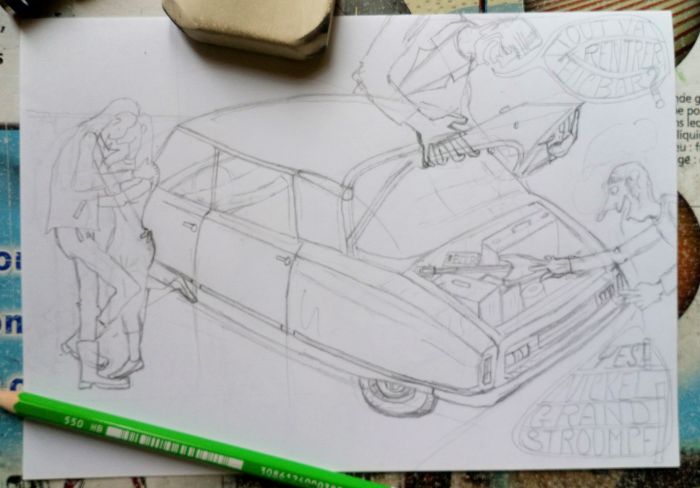 Toujours sous équipė par choix, pas d'ordinateur, pas de tablette lumineuse, juste des crayons une gomme du papier règle équerre compas.. C'est comme ça que le métier rentre..
