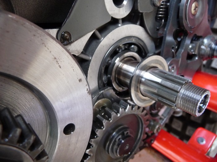 Côté pignon primaire et son volant moteur, ils sont montés sur un cône, ils s'arrachent mutuellement sans effort. Deux trous filetés M8 sont prévus à cet effet. Derrière, c'est du solide.
