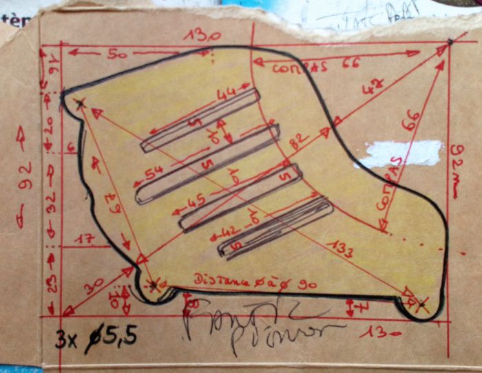 Une fois les côtes reportées sur votre patron en carton dur, vous le placez et l'affiner, sur les 3 emplacements, qui reçoivent le carter.. qui s'incruste parfaitement.