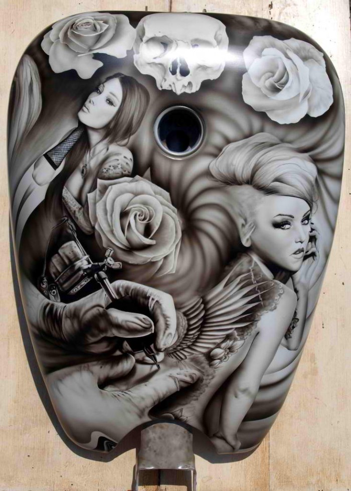 .RESTONS Dans le charme, on peut ttatouer sa moto préférée sur la peau de sa femme adoré,ou bien comme sur un custom ,une p'tite peinture sur le réservoir de son FANTIC avec sa copine adorée légèrement dénudée, bon dans les 2 cas vaut mieux l'accord indéfectible de sa moitié!! 👍 , 😍 , mais sur un plateau de plusieurs dizaines de motos,à l'ancienne, EFFET GARANTI!! 👍