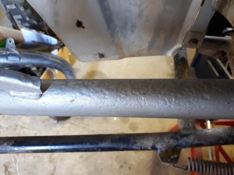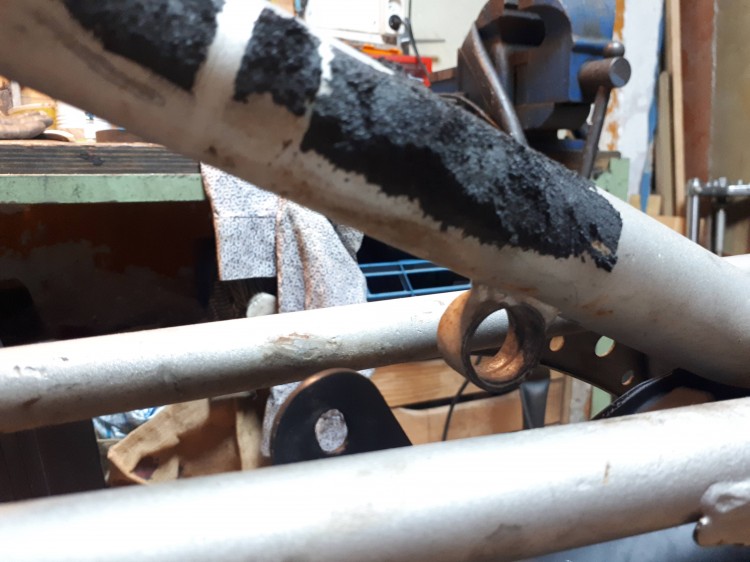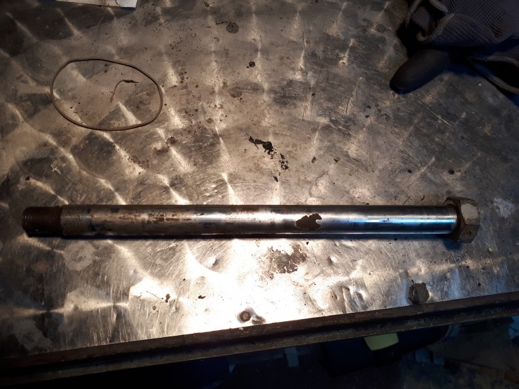 On continue le démontage en vue de la peinture. Jusqu'ici, on voyait bien que cette moto avait manqué d'entretien dernièrement et après la boîte à air bien salopée, j'ai bien compris que la moto n'avait pas été emmerdée par la graisse depuis un bon moment. Résultat, un axe de bras oscillant. Pis c'est tellement facile à trouver, un truc de 260 mm en 17,80 de diamètre. Ça a été fait dans une tige d'amortisseur mais le chrome a fini par sauter.