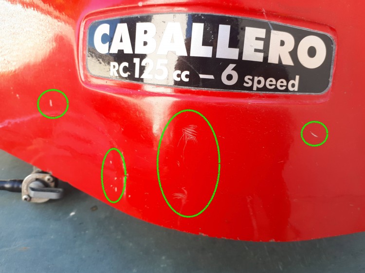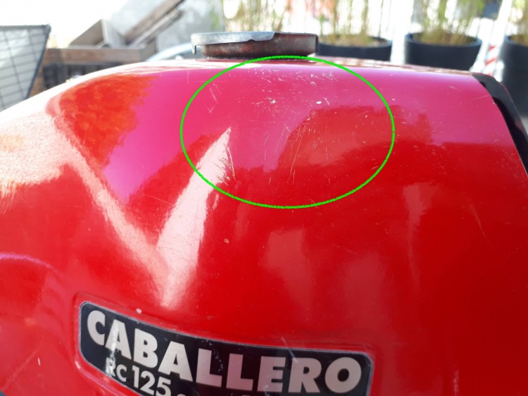 Le réservoir me semblait orange sous le rouge mais je ne suis pas certain. On dirait un rouge plus clair que la teinte actuelle qui ressemble à un rouge 3001. Une fois lustré au polish à plastiques Restom, elle brille bien, mais le revers de la médaille est que tous les défauts sautent aux yeux. J'ai bien envie de le repeindre. J'ai le réservoir bleu en secours.