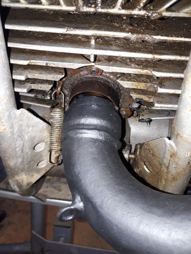J'ai déniché un pot qui ressemble à un FM150 de KS. Chris me dit qu'il faut se méfier parce qu'il y en a eu de différentes sortes et que tous ne se montent pas forcément sur ma moto. Je lui ai envoyé des photos parce que sur ce pot, qui n'est pas calaminé ni cabossé, je n'ai vu qu'une seule fixation pour un ressort, et aucune trace de meulage d'un autre anneau ou quoi que ce soit. Chris me répond que sur sa propre KS, il y a 2 ressorts à la sortie du cylindre.