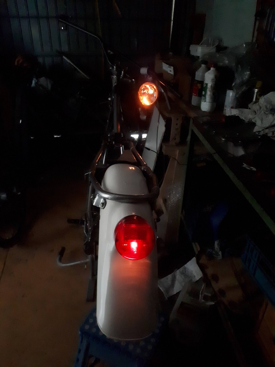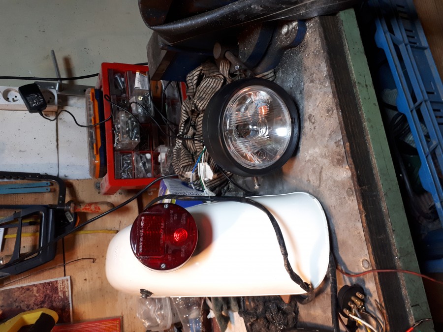 Un peu relou, le faisceau amputé de quelques fils. Mais avec un chargeur de GPS de récup', ça suffit pour envoyer 5,5V dans le circuit et repérer tout ça pour tout remettre à peu près d'origine avec veilleuse, code et phare. Si j'ai pas la flemme, je brancherai même la klapsonnette, tiens.