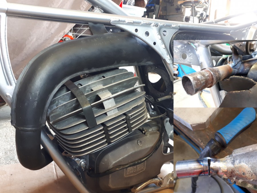 B.O. "corrigé" sans endommager la peinture, ouf ! Faut dire qu'il n'est pas d'une rigidité cadavérique... Papatte du pot remplacée, le pot tombe impeccable. Et silencieux réparé. Magie du TIG. Et merci x1000 Laurent L. !! Quand Laurent n'a pas de petit bout de tube à la dimension pour remplacer la partie cassée à l'entrée du silencieux, Laurent fait un tube... au tour 🤭
