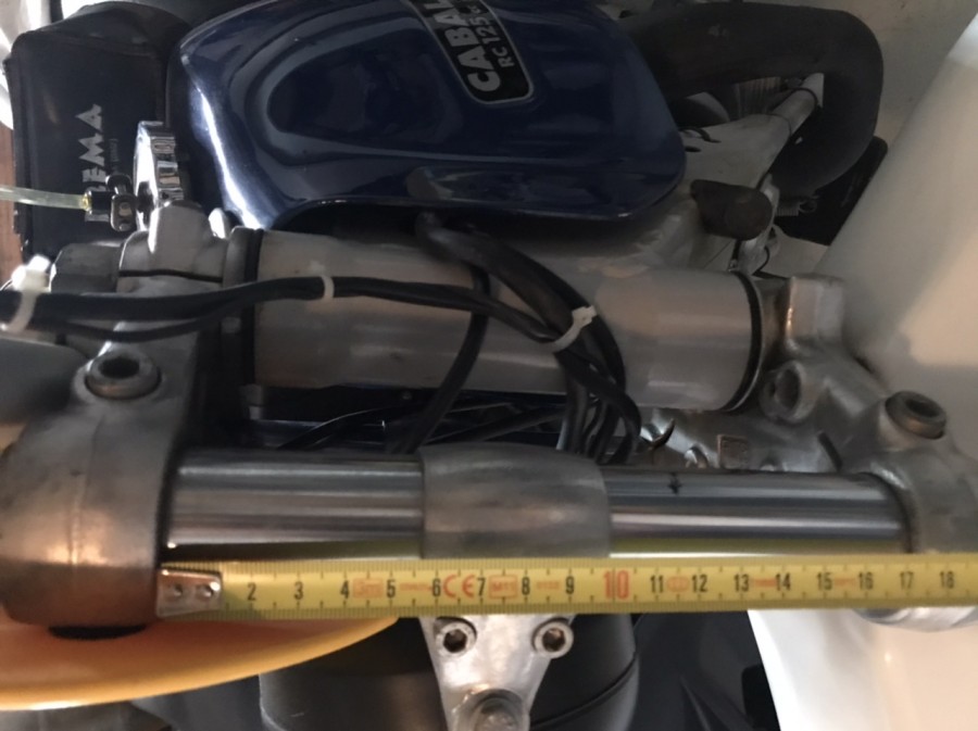 J'ai mis 6 cm entre le té supérieur et les pattes du phare. J'avais posé la plaque à numéros pour évaluer la position des pattes de phare. Ça paraît correct aux puristes de la KS ?