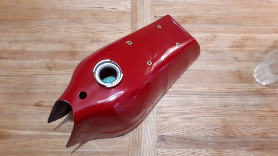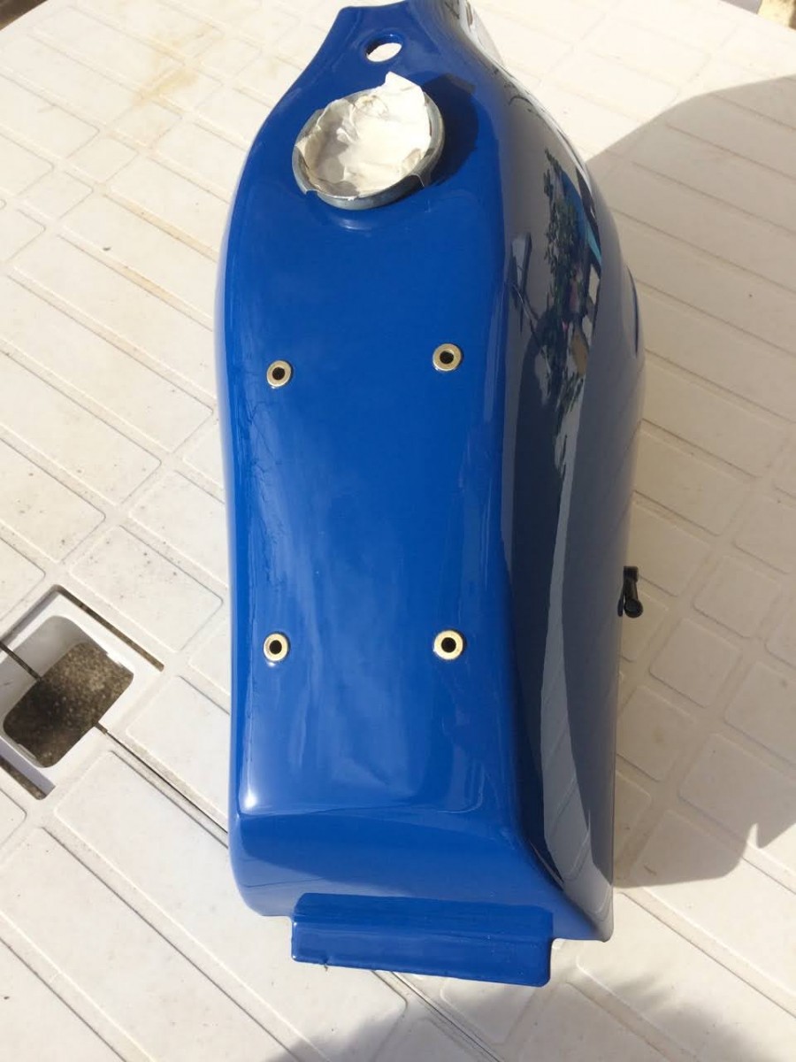 Cadeau de Noël de mon frère, une remise à neuf du réservoir bleu par son copain carrossier. L'admirateur poilu n'a pas sorti ses griffes en le voyant.