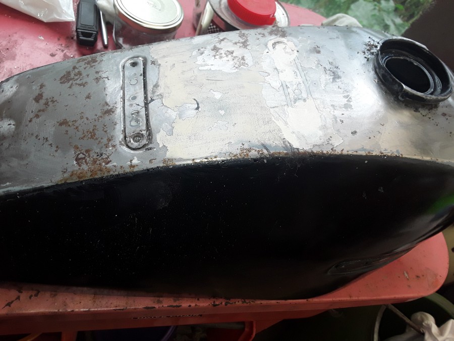 Beaucoup d'heures sur le réservoir ! Decapage, démastiquage (entre autre les attaches de borsetta qui etaient bouchées), surprise de trouver un beau beugne mastiqué !