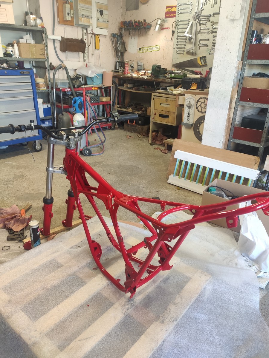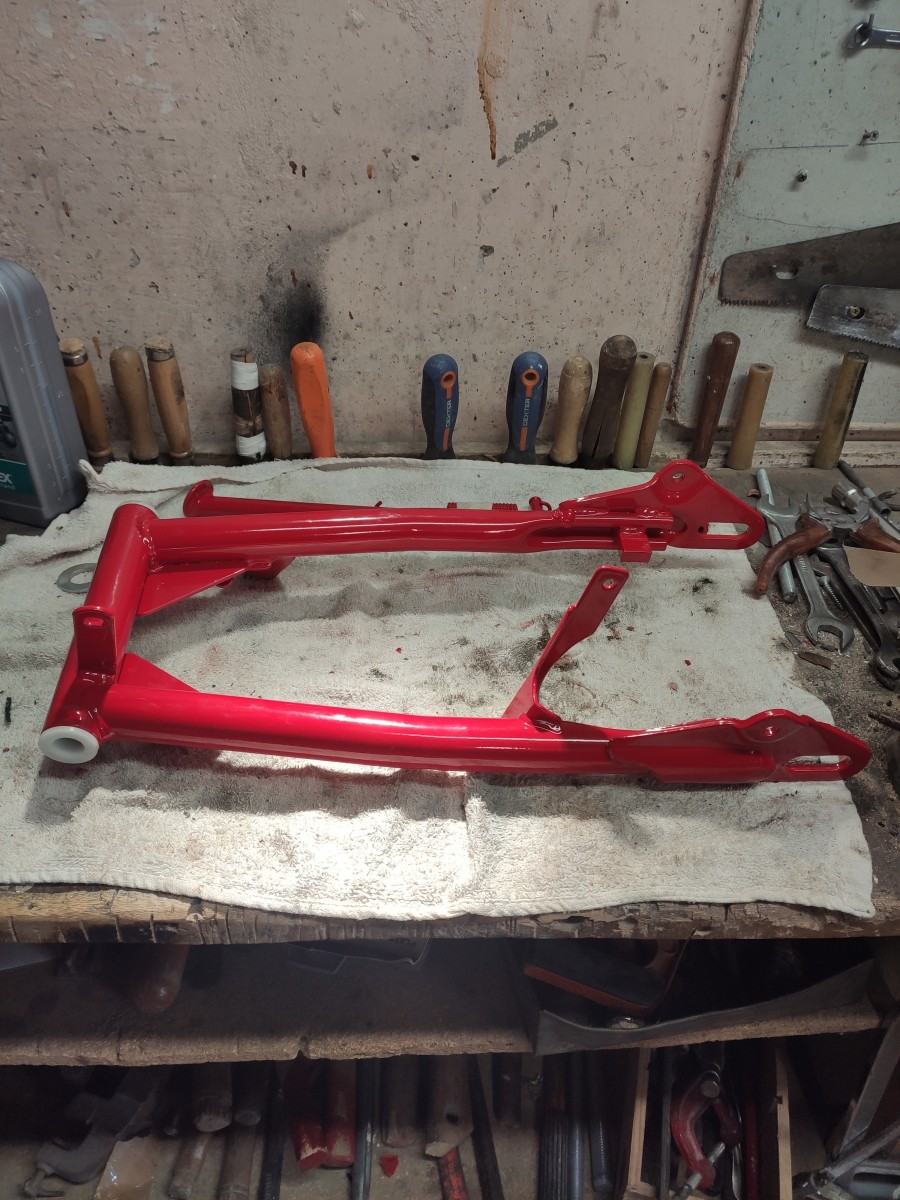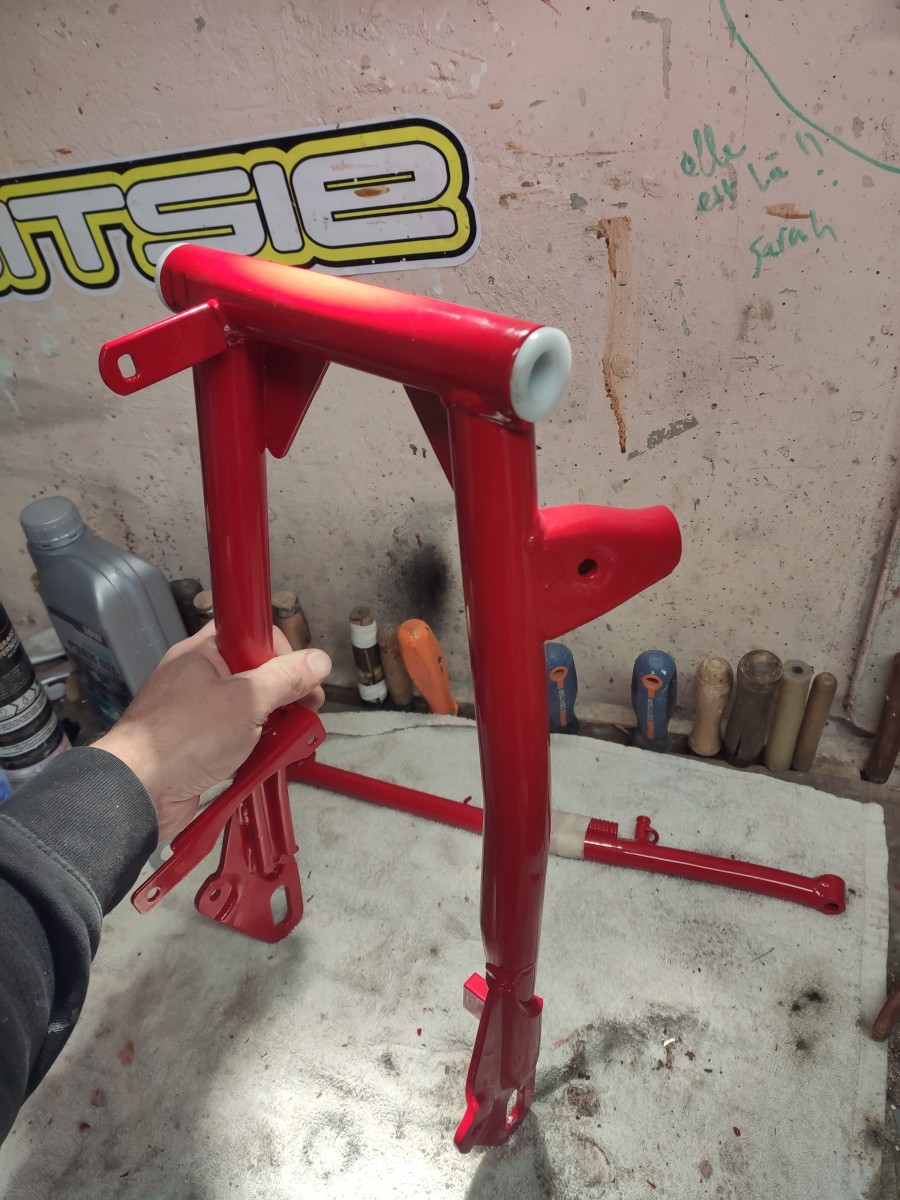 Pour commencer, on envoie la cadre (fournie par Rerou), la béquille, le bras oscillant et les tubes de fourche chez une entreprise de peinture indus avec qui j'ai l'habitude de travailler.