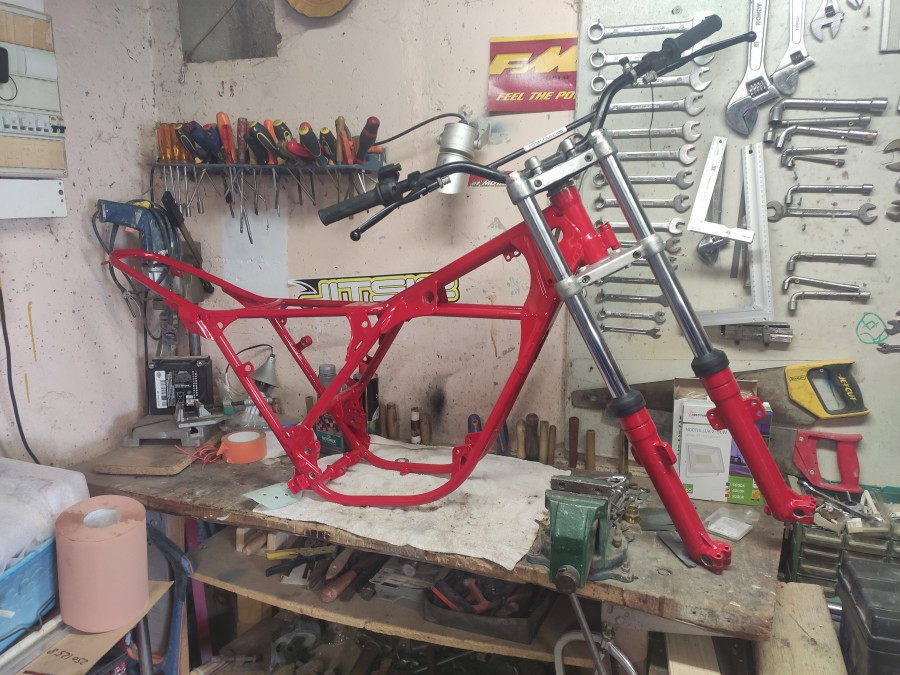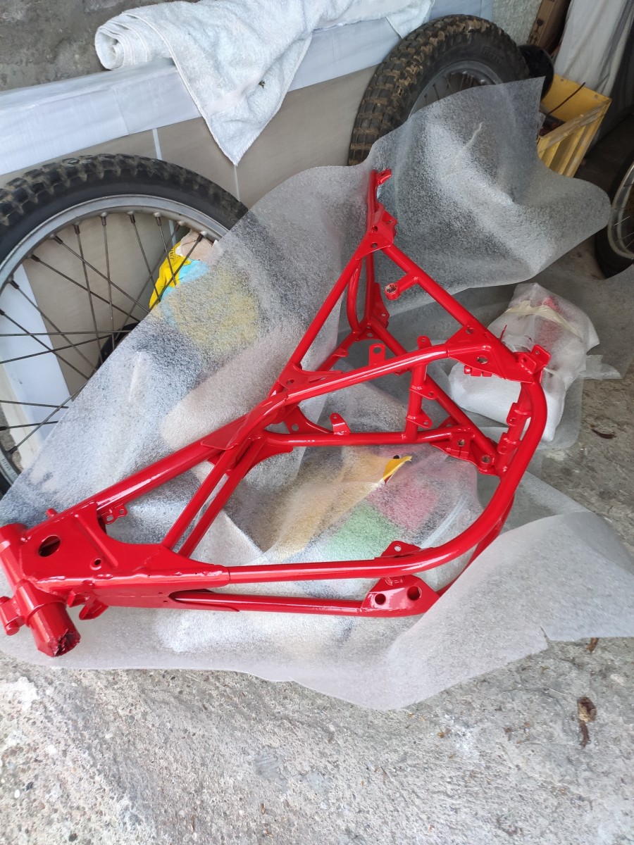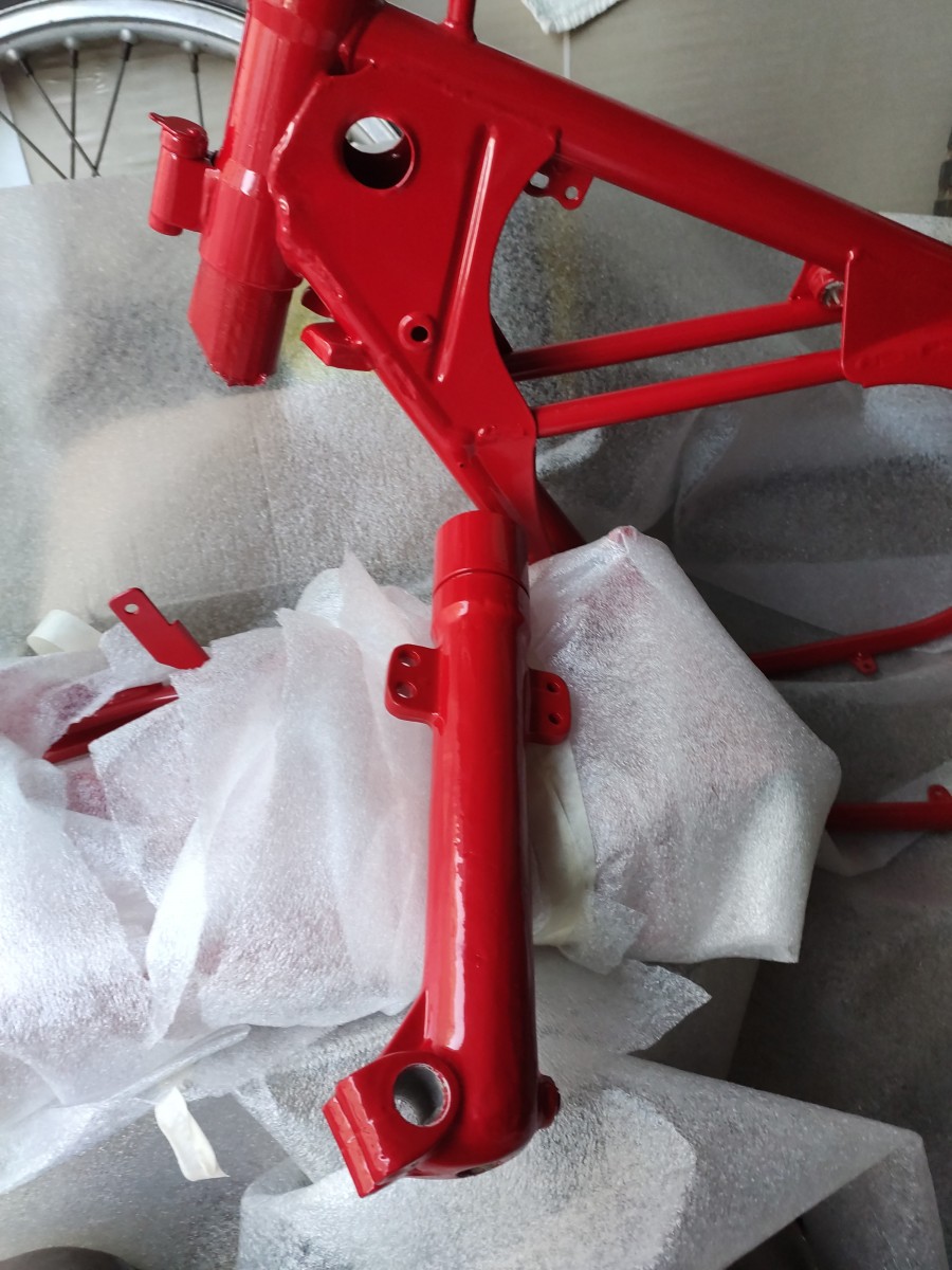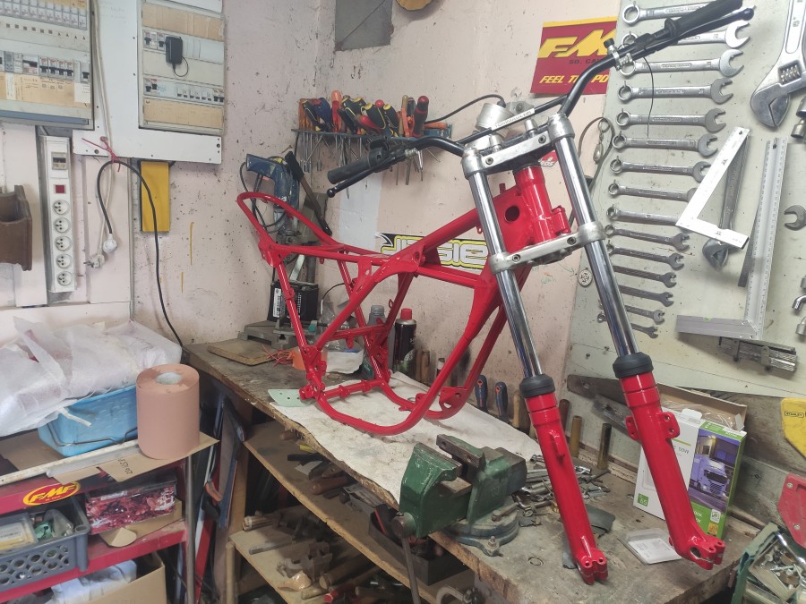 Pour commencer, on envoie la cadre (fournie par Rerou), la béquille, le bras oscillant et les tubes de fourche chez une entreprise de peinture indus avec qui j'ai l'habitude de travailler.