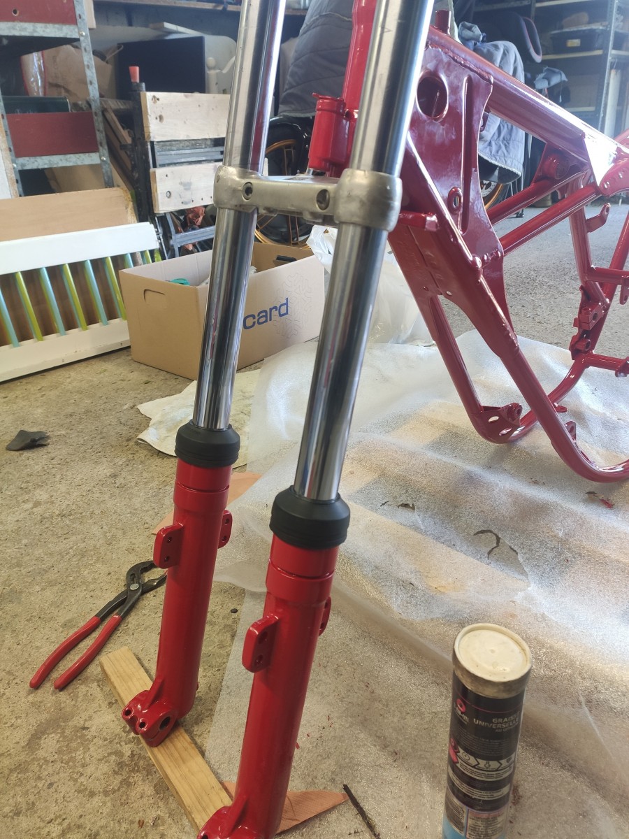 Je remplace ensuite les roulements de directions et on commence le remontage des tés de fourches + tubes de fourches