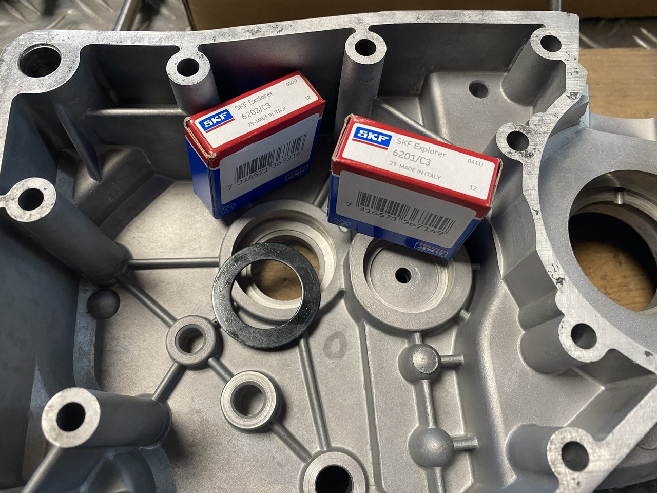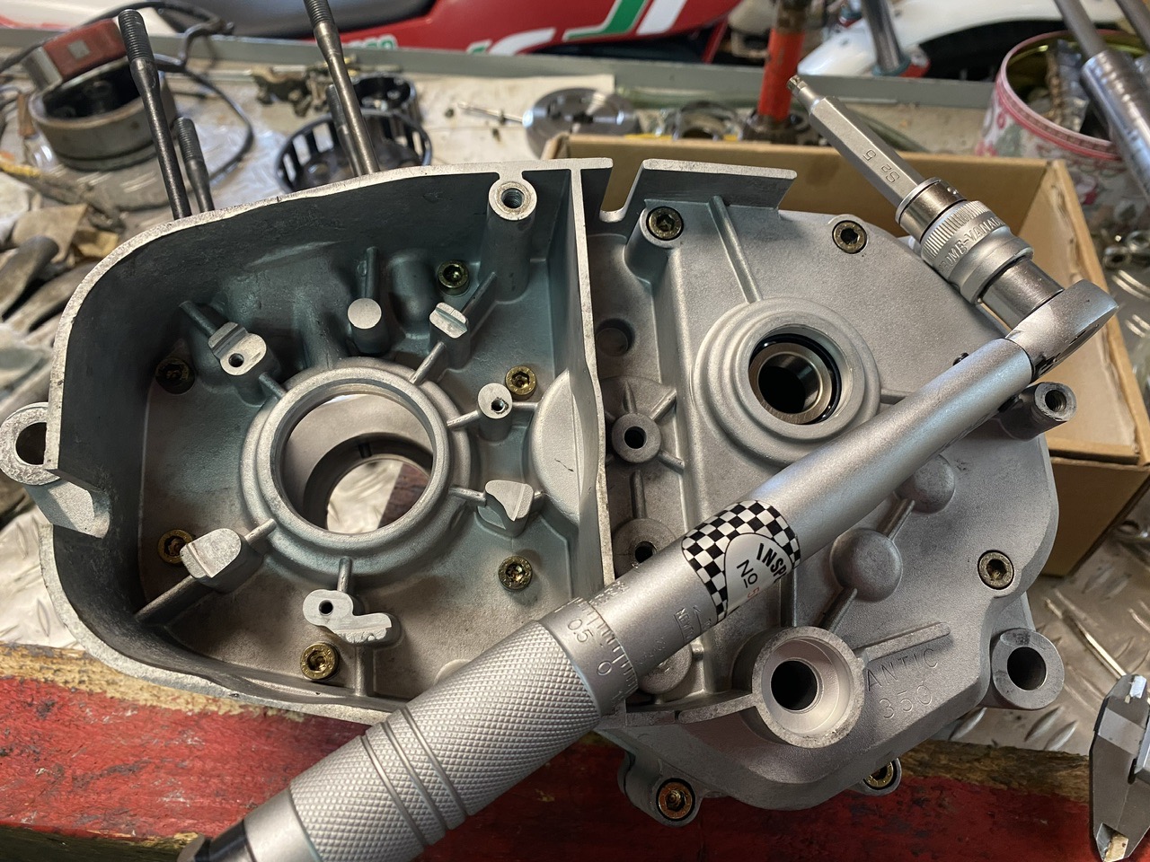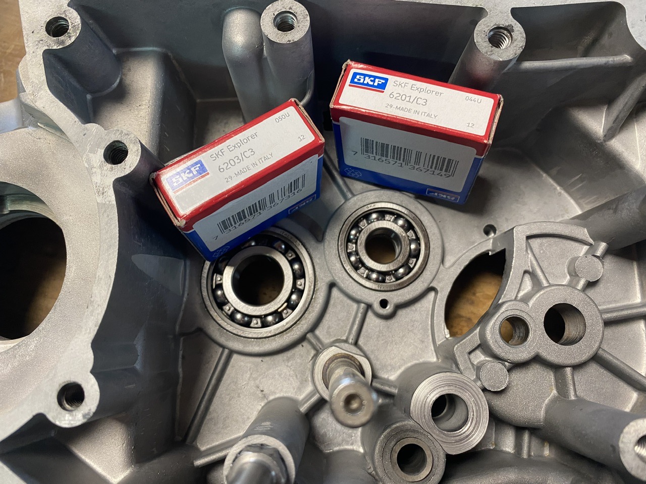 Puis montage des roulements de boîte avec un petit coup de chauffe au décapeur thermique sur les carters !