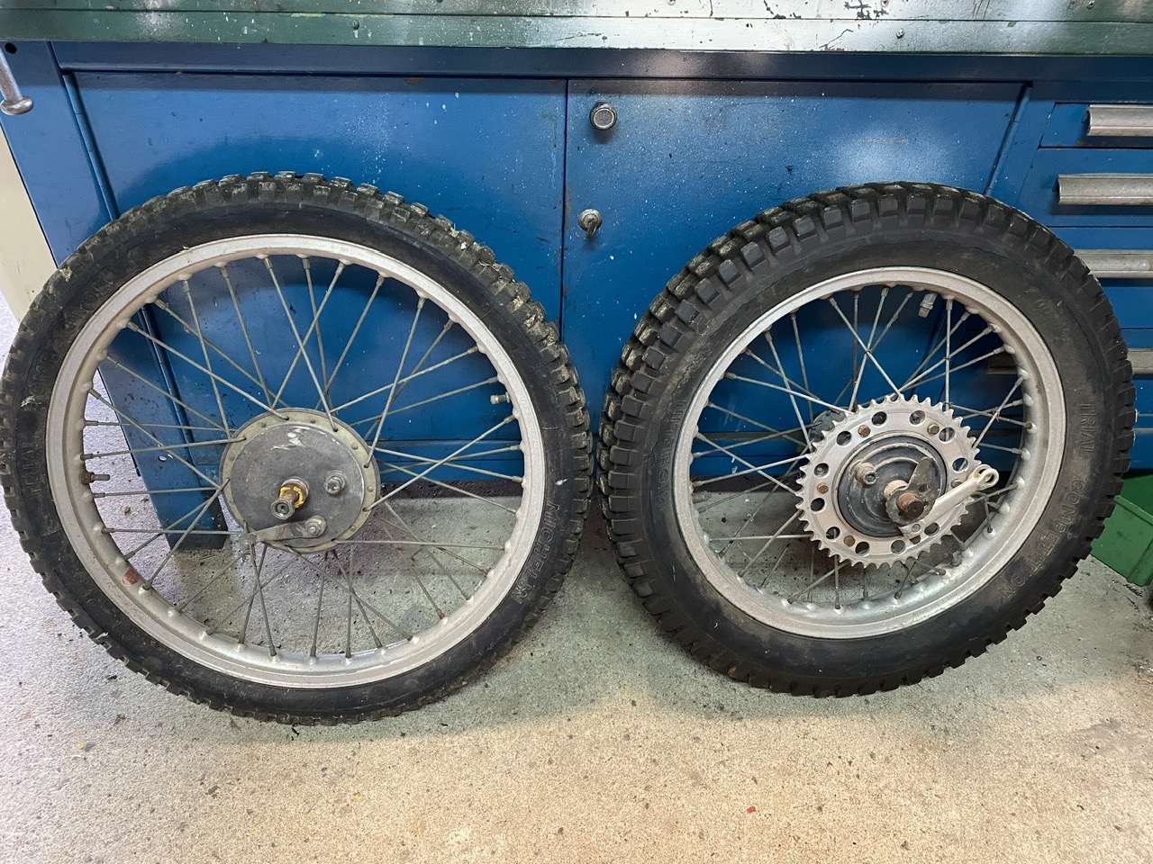 Refaire une paire à neuf, c’est un gros budget ! Il faut compter 180 euros pour une jante AR neuve et 140 pour l’avant, plus les deux jeux de rayons à 80 euros pièce, et le décapage et peinture pour les moyeux !