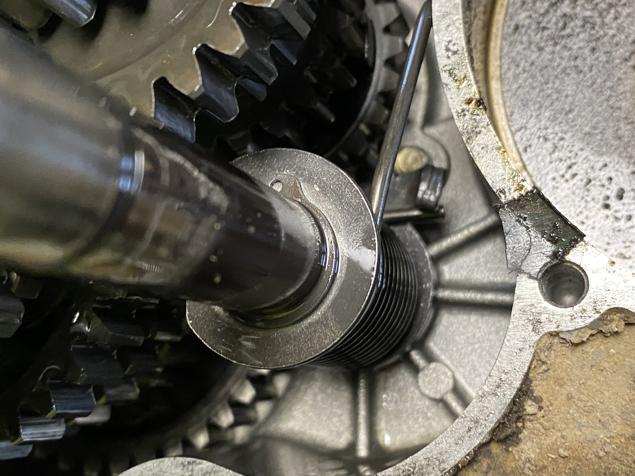 La principale difficulté c’est de remettre la plaquette d’arrêt du ressort du kick à la bonne position sur les cannelures de l’arbre sinon elle vient taper dans les pignons quand on actionne le kick 😬