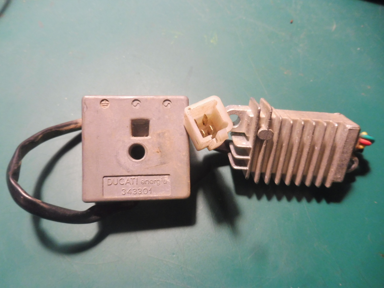 J'ai bien trouvé un régulateur (à gauche sur la photo?) avec cette référence "Régulateur de tension Guilera 14413000" Boitier identique au boitier "ducati energie 343301". Par contre, je n'ai aucune référence sur le redresseur (à droite). Comment retrouver le même pour le changer? . Je ne trouve aucune info sur le net. Pouvez vous m'aider s'il vous plait? Tout conseil me sera utile . Merci beaucoup ! Passez une bonne journée 😉