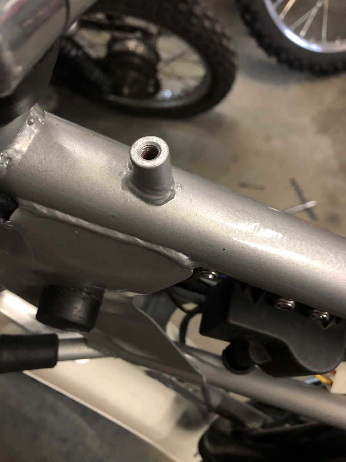 le sabot : que l'on retrouve sur le tx 160 1976 1977 cadre gris , reservoir plastique. Pour le refaire , je suis parti d'un sabot de tx 96 , un peu plus etroit et surtout plus long et pas les memes points d'attache en le recoupant et soudant une patte de fixation correspondant a une attache moteur .........résultats correct! 😕