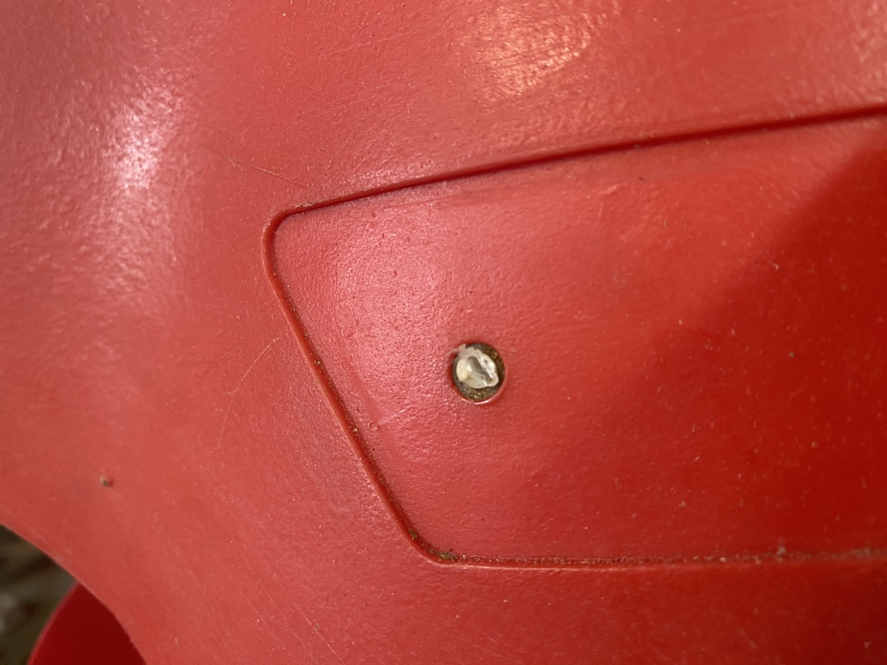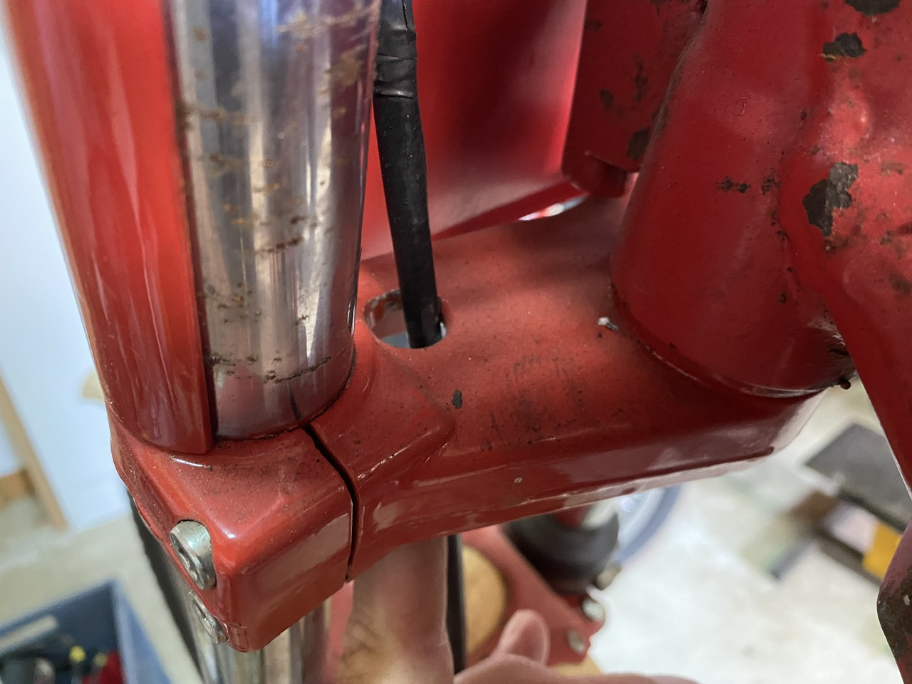 Le câble de frein n’a pas trop usé le passage dans le T inférieur, ce qui veut dire que la moto n’a pas trop roulé :