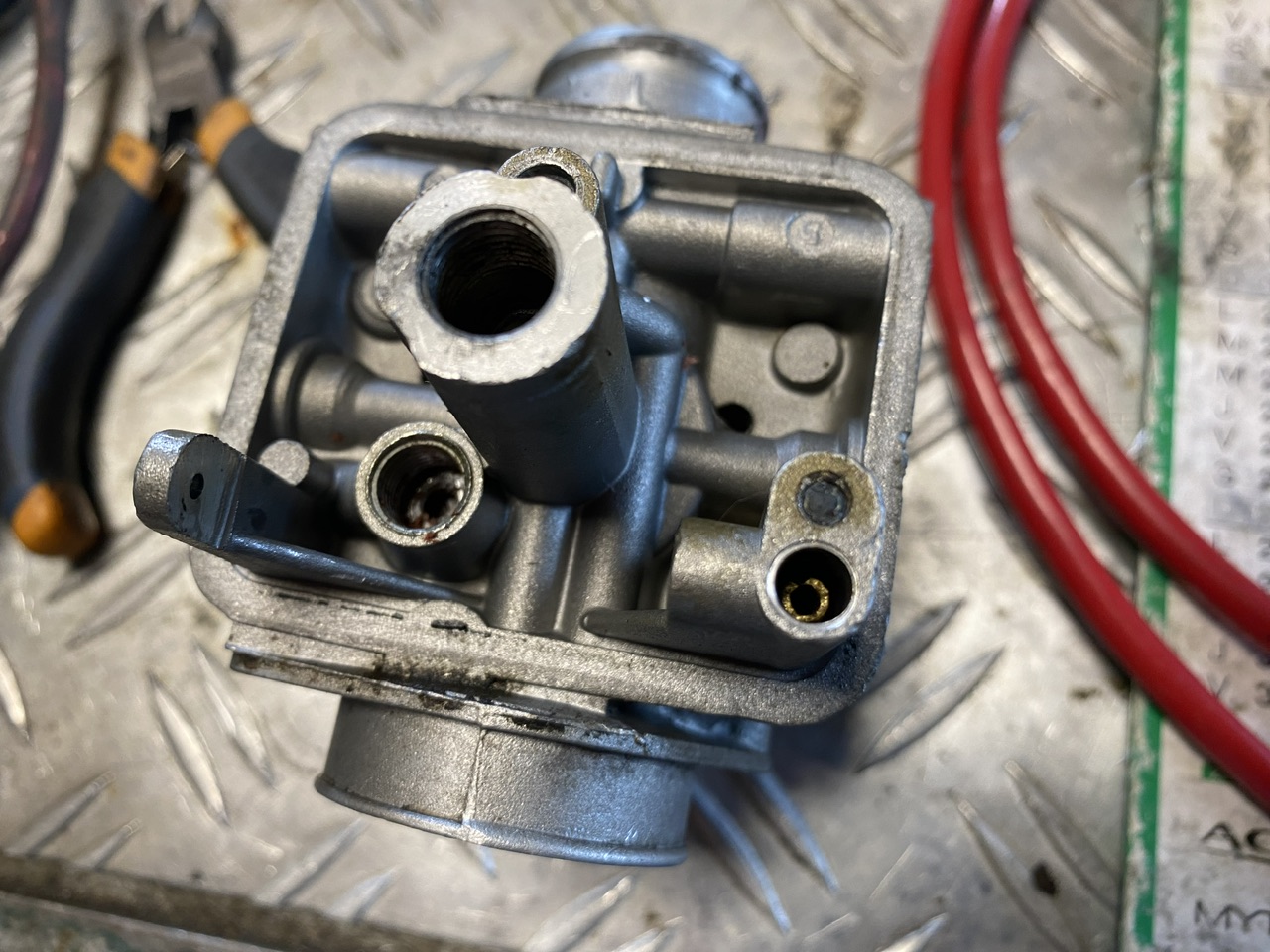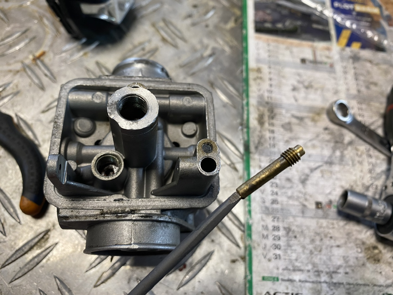 J’ai démonté le carbu pour le passer aux ultrasons et le gicleur du starter est cassé dans son logement !