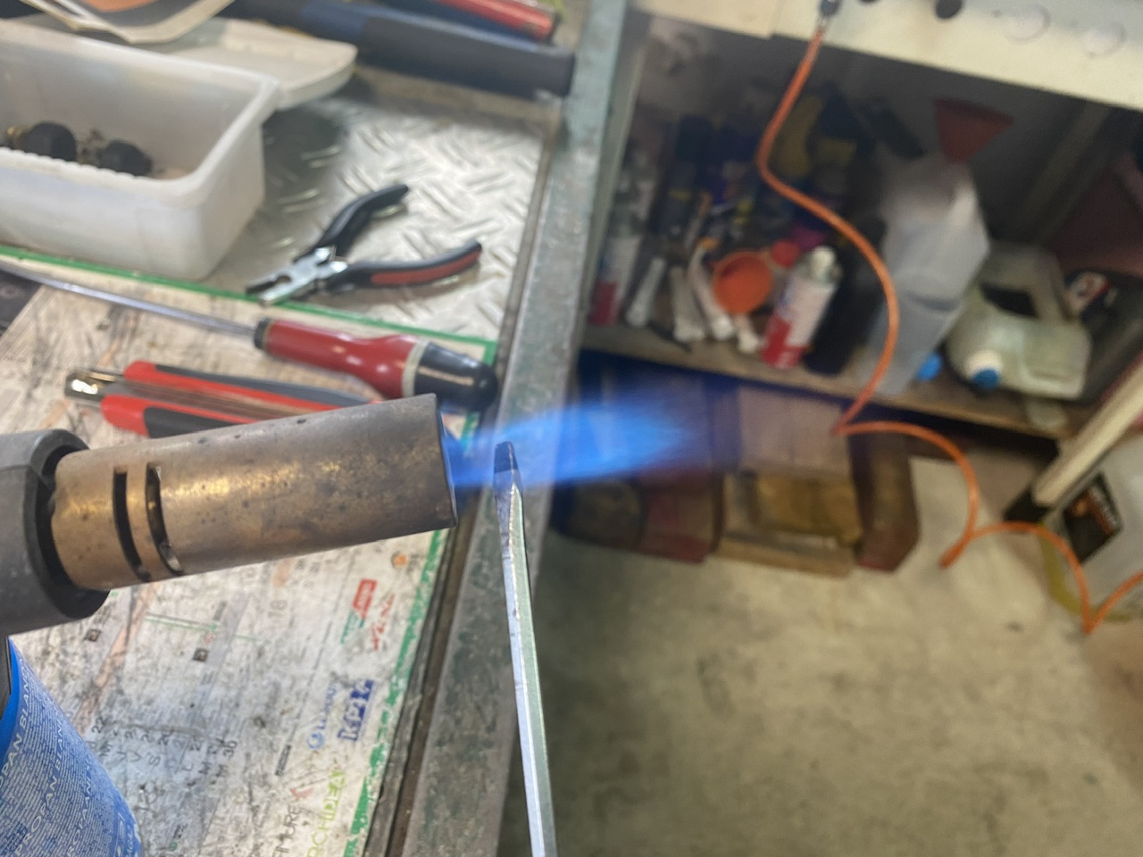 J’ai pris une petite lime de chaîne pour tronçonneuse que j’ai appointé ! Un petit coup de marteau pour la faire rentrer dans le laiton du gicleur, un petit coup de chauffe au décapeur, et c’est sorti tout seul 😉