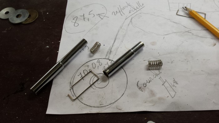 les fourches fonctionnent elles sont faite avec des antennes de radio un ressort a l'intérieur et le tour et joué , pour l'huile on verra plus tard , j'utilise beaucoup du circuit imprimé d'électronique pour différente pièce , car très facile de découpage ajustage et surtout soudure .TOUTE LA MAQUETTE EST SOUDER A L'ETAIN ;