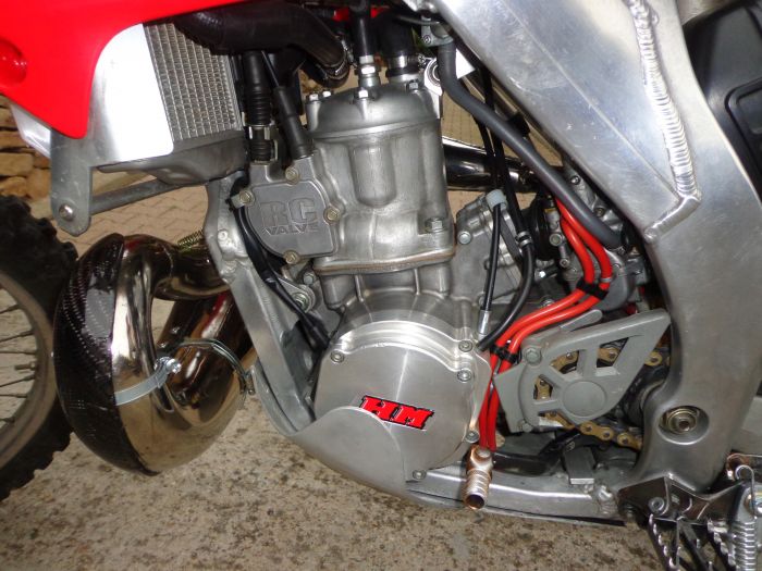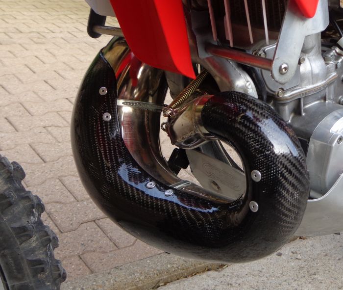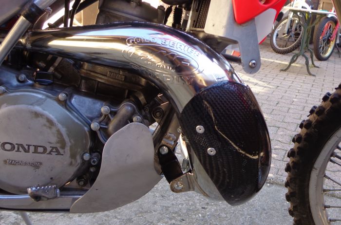 Reprise des alu, des chromes (échappement Gnarly), transformation du silencieux HM en 100% absorption, avec une mitraillette que j'avais dans mes pièces; achetée à Novegro ou chez KTM Klassiker. Je ne sais plus.