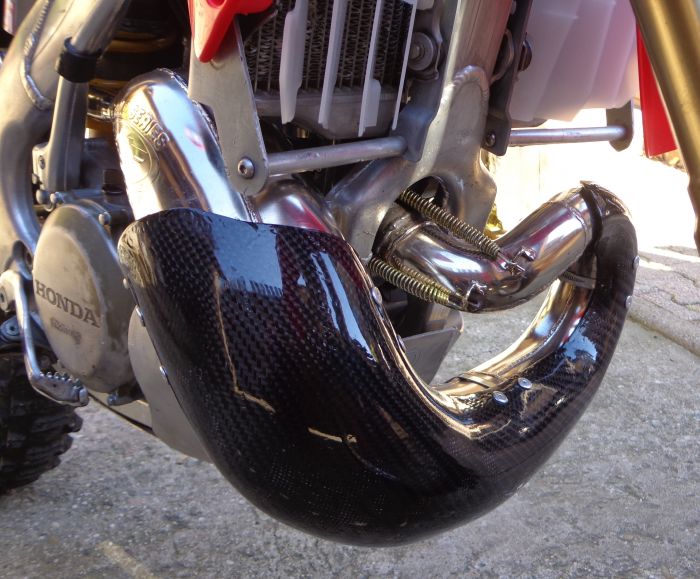Les équipements : durite de frein avant aviation bleu, pot FMF Gnarly (c’est celui qui apporte le plus à bas régime), cale à l’admission de 6mm, clapet V-Force, guidon Pro-Taper, Té de fourche supérieur TAG Métal, protège radiateur CRD, sabot moteur alu CRD et un interrupteur pour la coupure des valves été monté sur le circuit électrique (très efficace, lors de l’essai, j’ai bien senti que cela empêchait le moteur de prendre des tours afin qu’il reste sur son régime de couple)