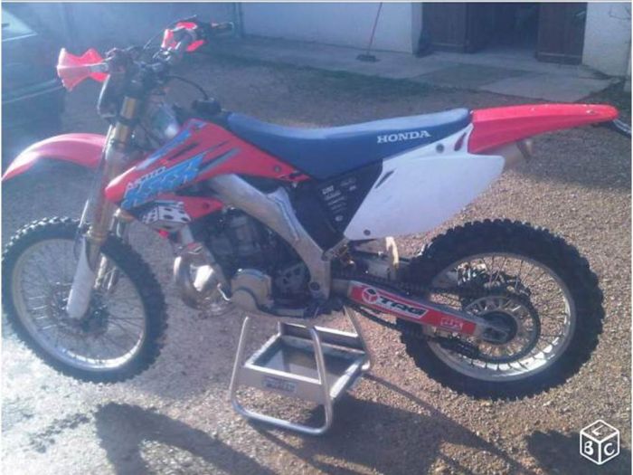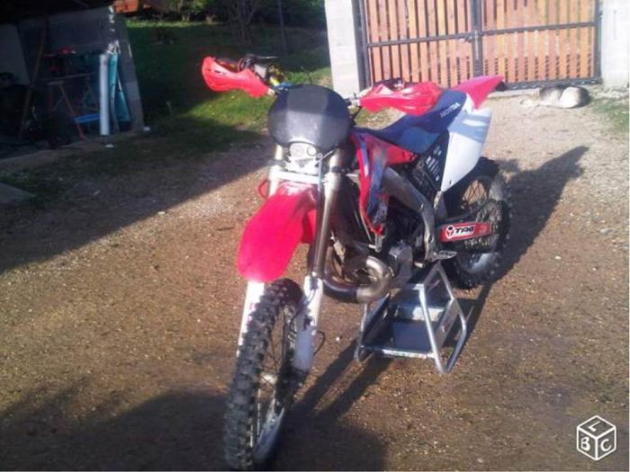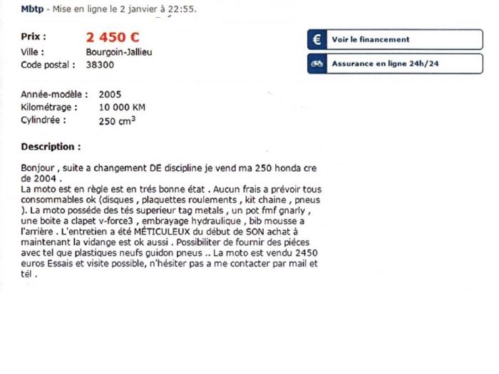 Un HM 250 CRE de 2005, il ne m’en avait pas parlé, avant, car la moto était en vente à 2600€ en décembre mais une remise en vente en janvier vient de sortir à 2450€, en discutant un peu cela pourrait faire le budget de 3000€ que je me suis fixé, remise en état comprise. 😉