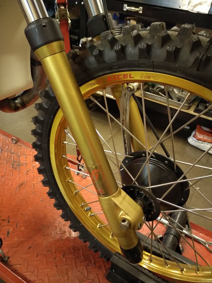 Ce 125 cross préparé en Belgique ( 2 ou 3 machines faites ) a couru dans le championnat Belge. Le châssis est un 80 cross avec fouche FI amortisseurs OHLINS jantes exel or 19 et 21 . Tous les axes sont en titane ainsi qu'une partie de la visserie. Commande d'embrayage hydraulique magura. Bas moteur 125 cross préparé ( course et alésage différents ) cylindre a clapets avec boosters) piston forgé. Carburateur KEHIN 36 a boisseau plat.