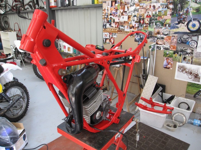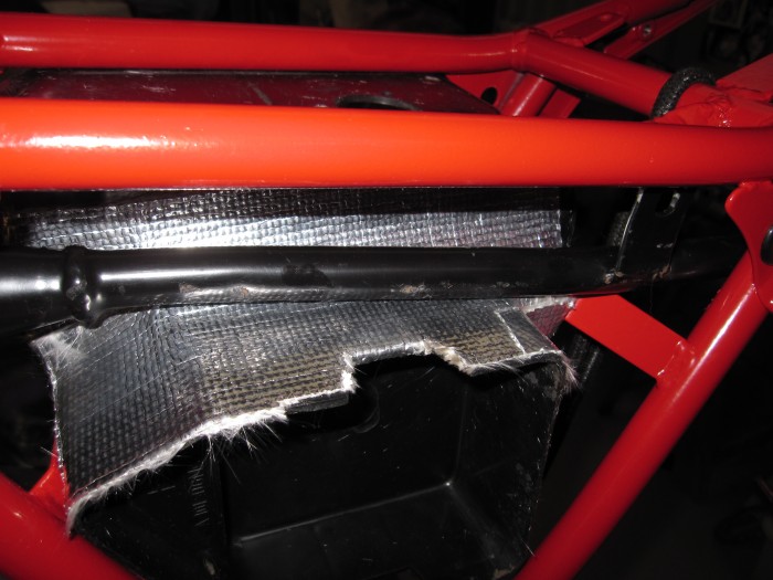 Montage à blanc ( même si, ici il ya beaucoup de rouge ..) du silencieux maison.Il se place bien,restera à faire une belle patte de fixation.Pour une restau low cost, ça va l'faire ;)