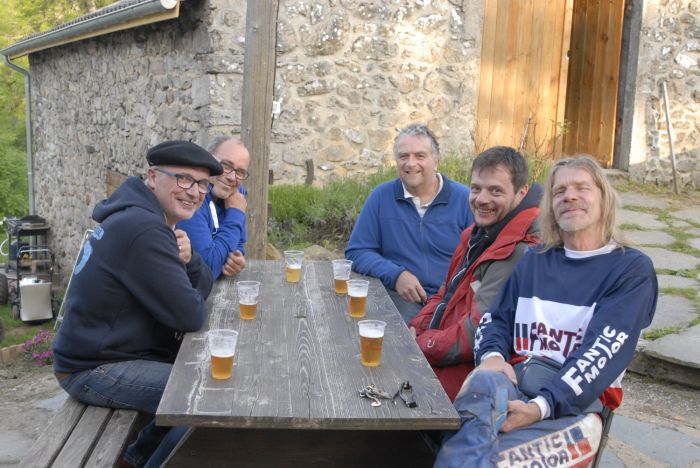 La belle récompense après la grosse journée du samedi. Que des gars du Club Fantic. De gauche à droite : Phil15, Loic, Bruno, Romain et ma pomme en costume Fantic. Même le photographe en est, Marc Pidou.