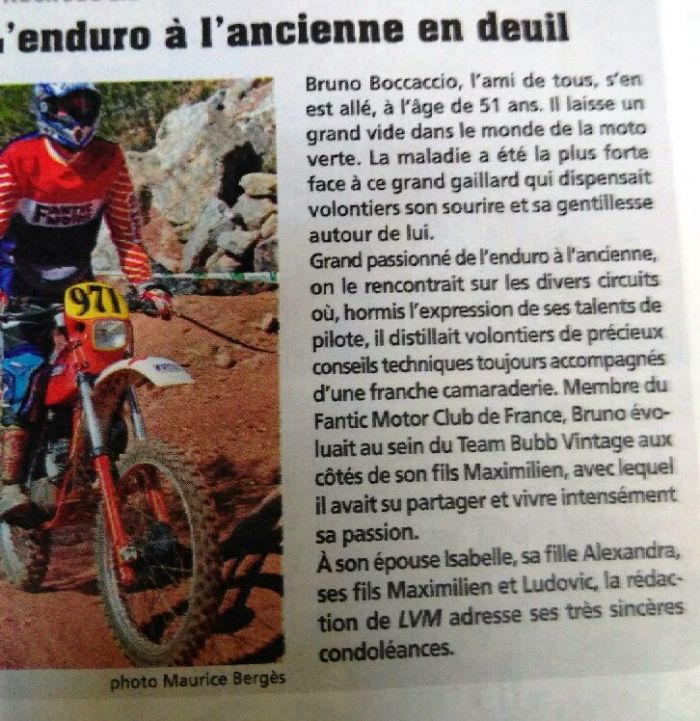 Cher Bruno, que de bons moments partagés avec toi et Max, ton fils, au gré des compétitions, autour de la tente du club. Toujours avec le sourire, avec cette gentillesse, cette amabilité et cette écoute qui te caractérisaient. Le bon conseil pour faire avancer correctement des motos vieilles de plus de 35 ans.