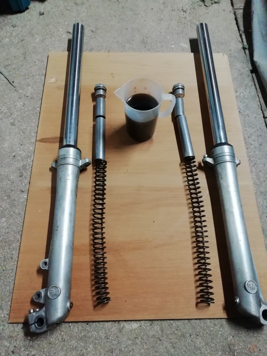 Pour l’huile, moi je mets de la 5W dans mes fourches de moderne, et de la 7,5 voire 10 W dans les fantic !