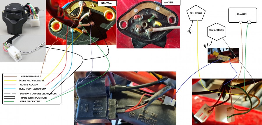 Pour le comodo, ça m'a l'air disposé pareil, donc faut pas se occuper des couleurs mais replacer les fils de origine, à l'emplacement qu'ils étaient, mais sur le nouveau comodo..
