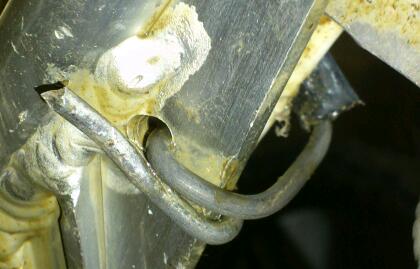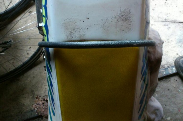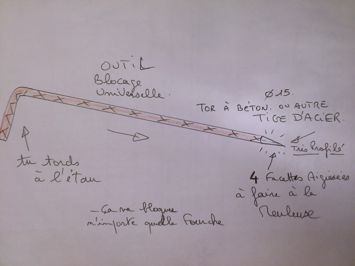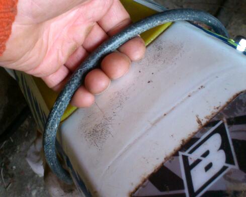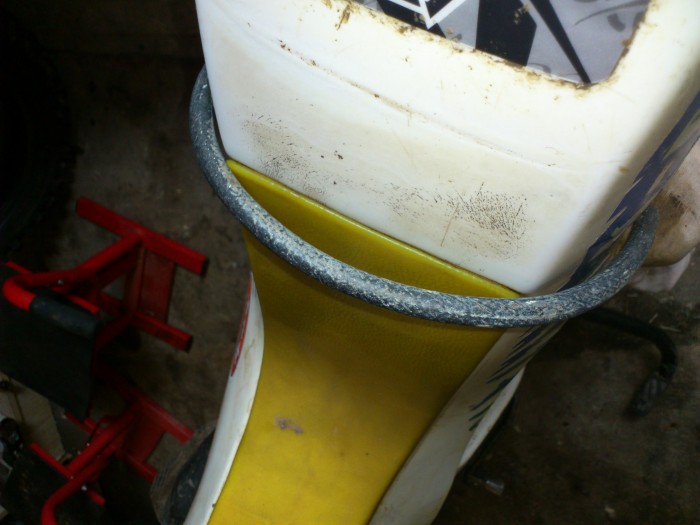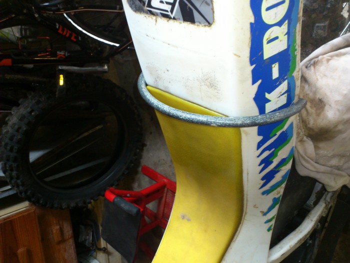C'est sur qu avec la graisse étudiée pneu, ça doit être bien mieux !! .faut que jmen trouve un peu!! ...........................bon c'est l heure du p'tit dêge , prenez une demie baguette , mettez du beurre très tendre dessus..mais alors une belle couche! et saupoudrez de pétales de maïs , maintenant monter d un côté pour représenter une bonne côte , et avec votre doigt imitez la roue arriere d'une randojoueuse arrivant à toute blingue ,sur une bonne côte hardue de sous bois...bien mouillée et grasse..recouverte de 5 a 10 cm de feuilles en décomposition hyper glissantes .....vous montez au max...pas besoin de fr de repère, ça se verra!! Car le but cest d'arriver à grimper le + haut possible!! Et bien sur en slick... spécial, car le pneu est ...carrément comme lisse ,pâté de terre collante et de feuilles!! C'est fendard..mais hyper fatigant!!!!! Et surtout, quand t'es bloqué ,la roue arr qui burine derrière, et toi les pattes écartées tentant vainement de ...pas redescendre!! Bin faut couper le moulin, et chopper la moto pour fr demi tour!! si elle est déjà pas ruinée ,le cale pied planté dans le gras, ..à l'envers!! ( ça sent le vécu?? n est ce pas??!!...ne riez pas! ) et bin, j'en avais marre de m esquinter la main à chopper la moto ...on sait jamais où!? Donc j'ai tenté la sangle ,peu épaisse ,c'est vrai mais pas facile à attraper quand t'es pressé,gant mouillé, et moto qui descend sans ton contentement irrémédiable!! Alors j'ai emmanché dans les 2 trous que javais percé pour y mettre une sangle plate comme on voit sur les motos de franchissement. J'ai mis un long fil de fer, de bon diamètre genre 4 mm , sur lequel j'ai enfilé un morceau de tuyaux de buse de karcher ( très solide et petit diamètre ) , le fil de fer est mis en extérieur..de façon à ce que la durite en soulevant, n écrase pas le garde boue, et reste efficace. C'est super pratique et rapide à chopper, en cas de chute ou pour bouger l engin quand t'es à côté. Le tuyau bouge,et gêne pas le déplacement du petit postérieur qui cherche en allant sur le garde boue arr à donner un max d adhérence à l engin qui lui a tendance à soulever de la roue avant!! Plein gazzzzz Ye'eeeyééeeeee!!!
