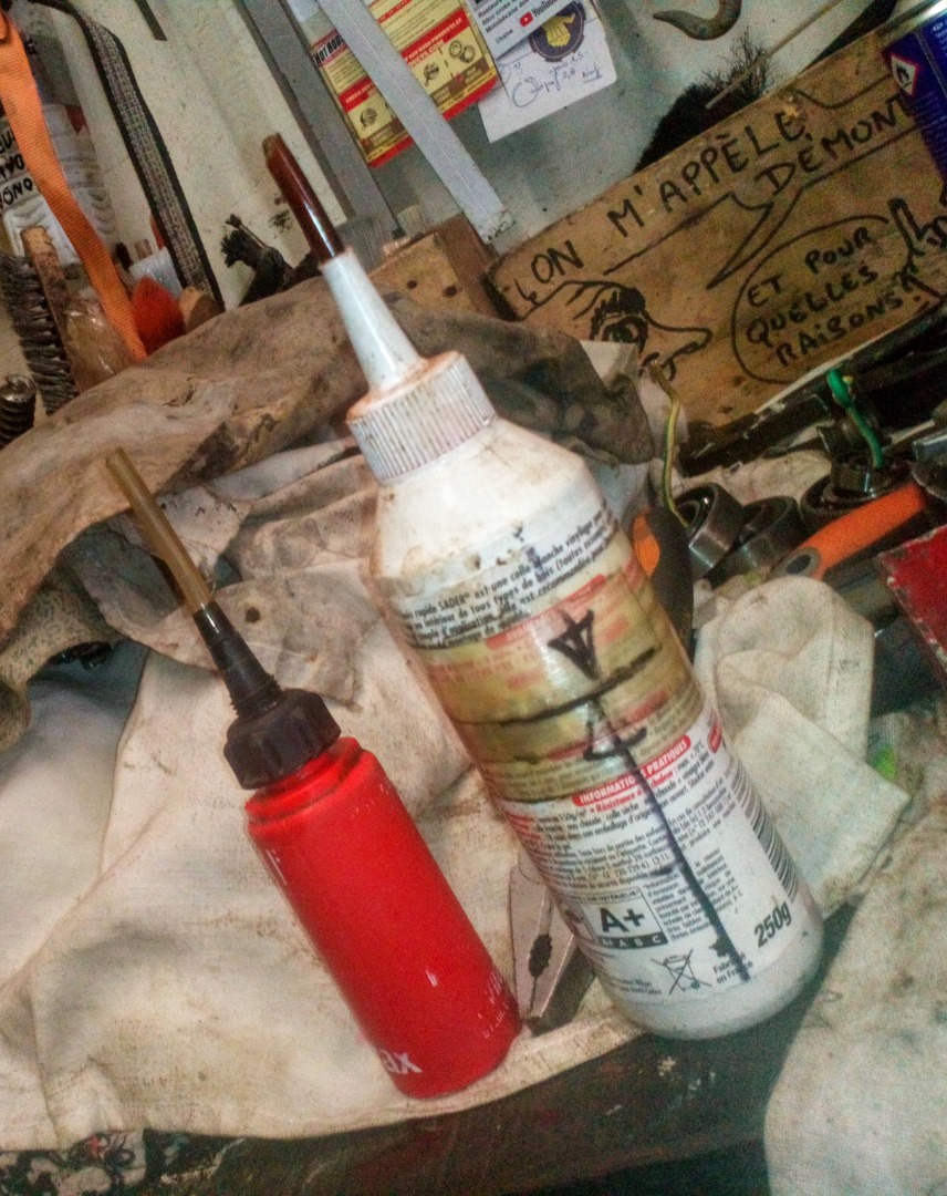 Suffit de récupérer les burettes plastiques, genre colle à bois...loctite rouge ect...de rallonger avec un petit tuyau.....le bec verseur qui sera plus précis...