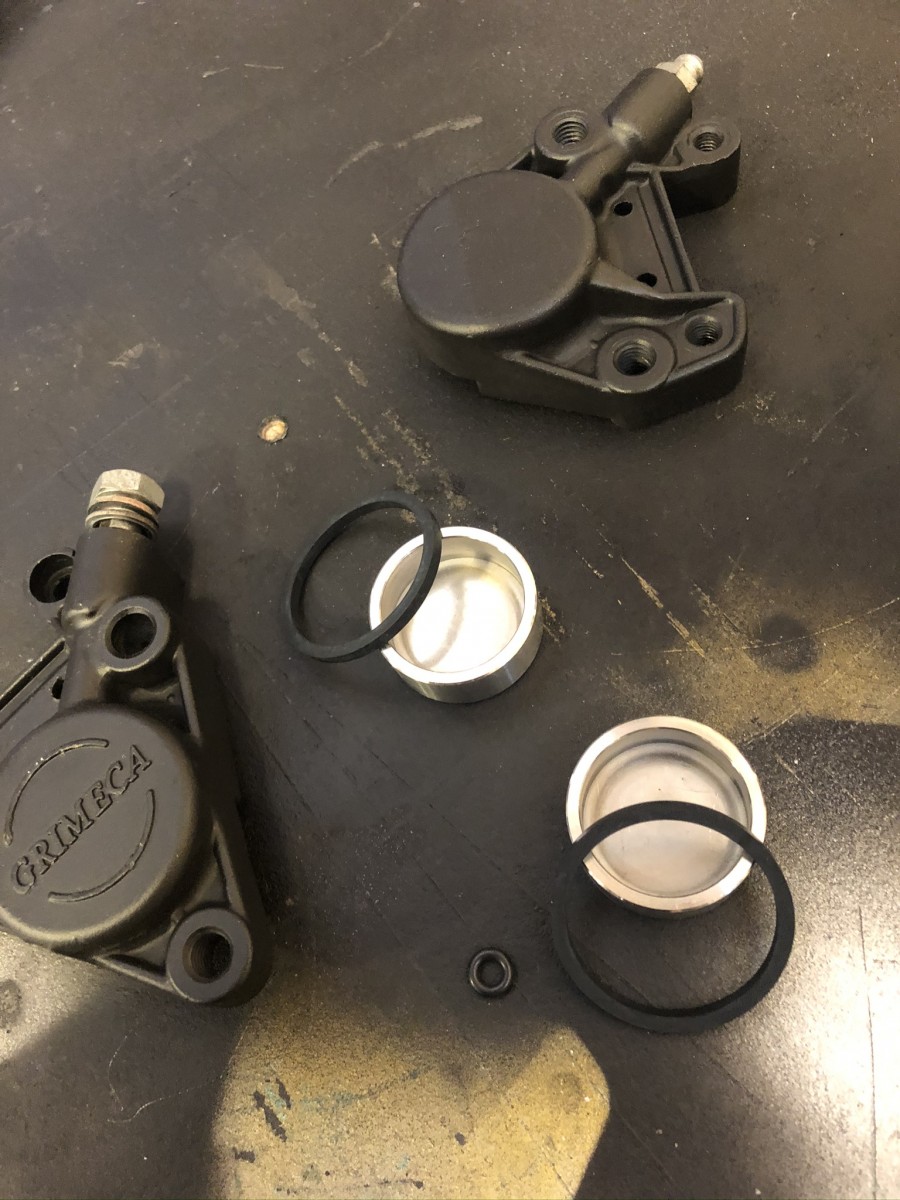 Mes étriers sont ceux d'origines (AV et AR des Griméca), j'ai juste changé les pistons et les joints pour les remettre à neufs... Par contre j'ai suprimé le maitre cylindre sous la plaque phare pour le raccorder directement avec un maitre cylindre moderne au guidon...